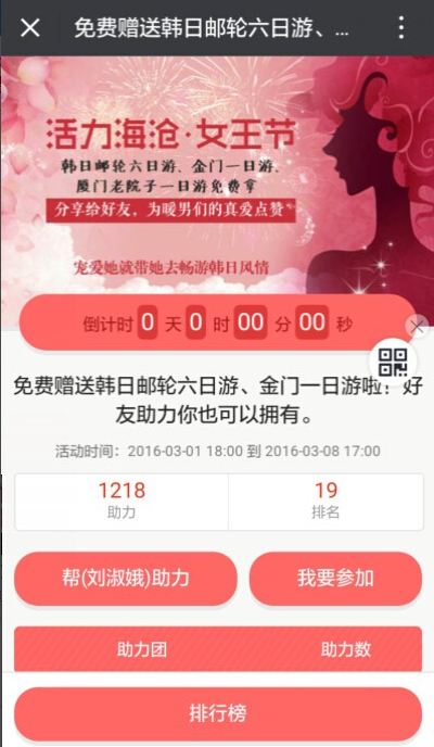 微助力活动是微信公众号常见的一种营销手段,公众号运营者可以通过转发一些服务产品或者实物来扩大自己产品的受众和品牌认知度,我们的旅行社同行可以将线路产品、门票或实物产品等作为奖励,带动自己微信公众号的粉丝参与助力活动,分享身边好友帮忙点击助力,以助力最多为最终赢家可获得该产品体验。